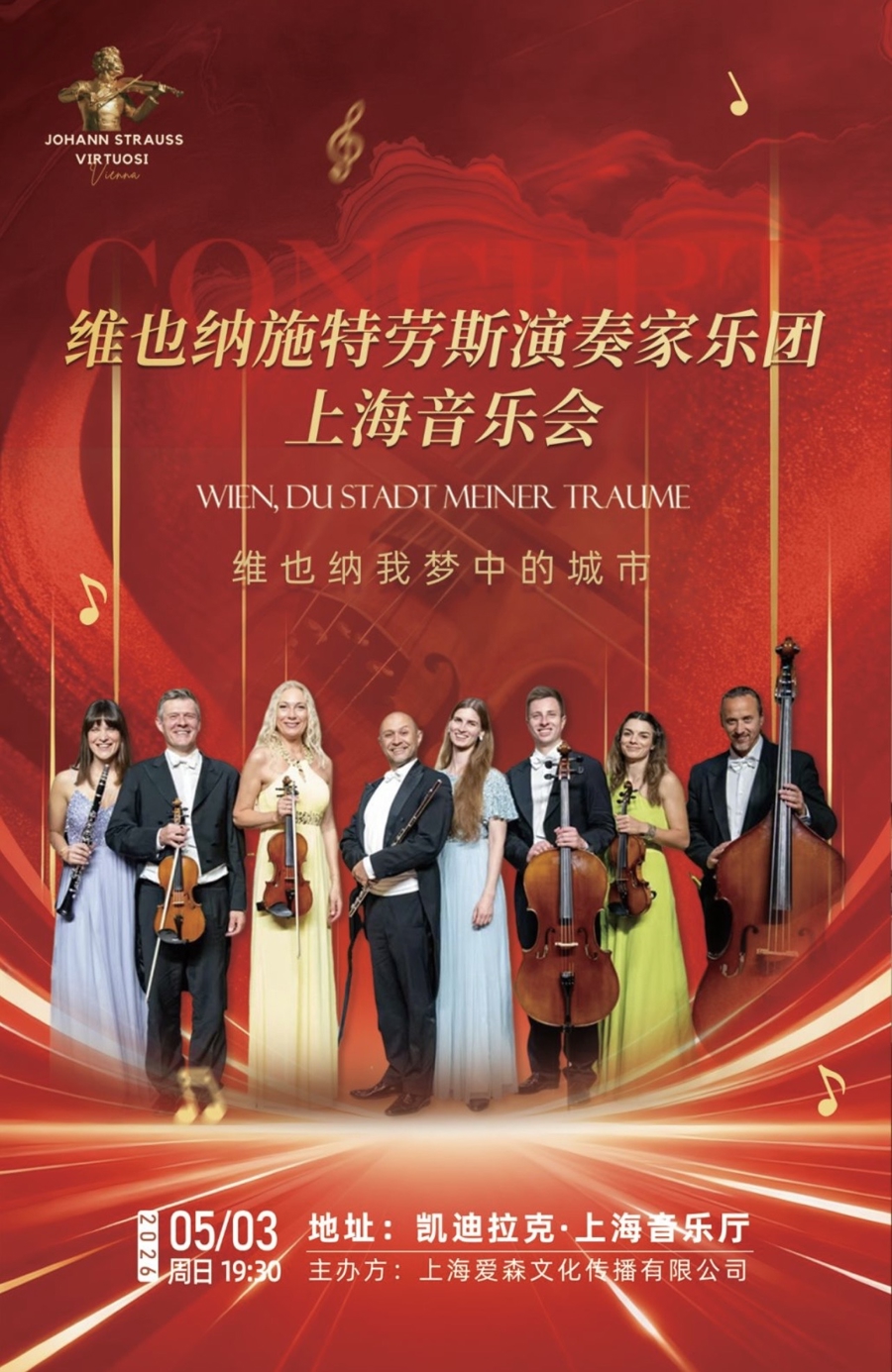 5月3日,维也纳施特劳斯演奏家乐团将为观众带来一台以施特劳斯家族作品为主的音乐会。该乐团以圆舞曲之王约翰·施特劳斯命名,成员均经过严格筛选,常年在维也纳美泉宫及索菲亚宫殿驻场演出。音乐会将演绎《南方的玫瑰圆舞曲》《蓝色多瑙河圆舞曲》等经典曲目,用轻快的节奏、恢宏的演绎,带领观众感受维也纳音乐的独特韵味,解锁假期的浪漫与愉悦。